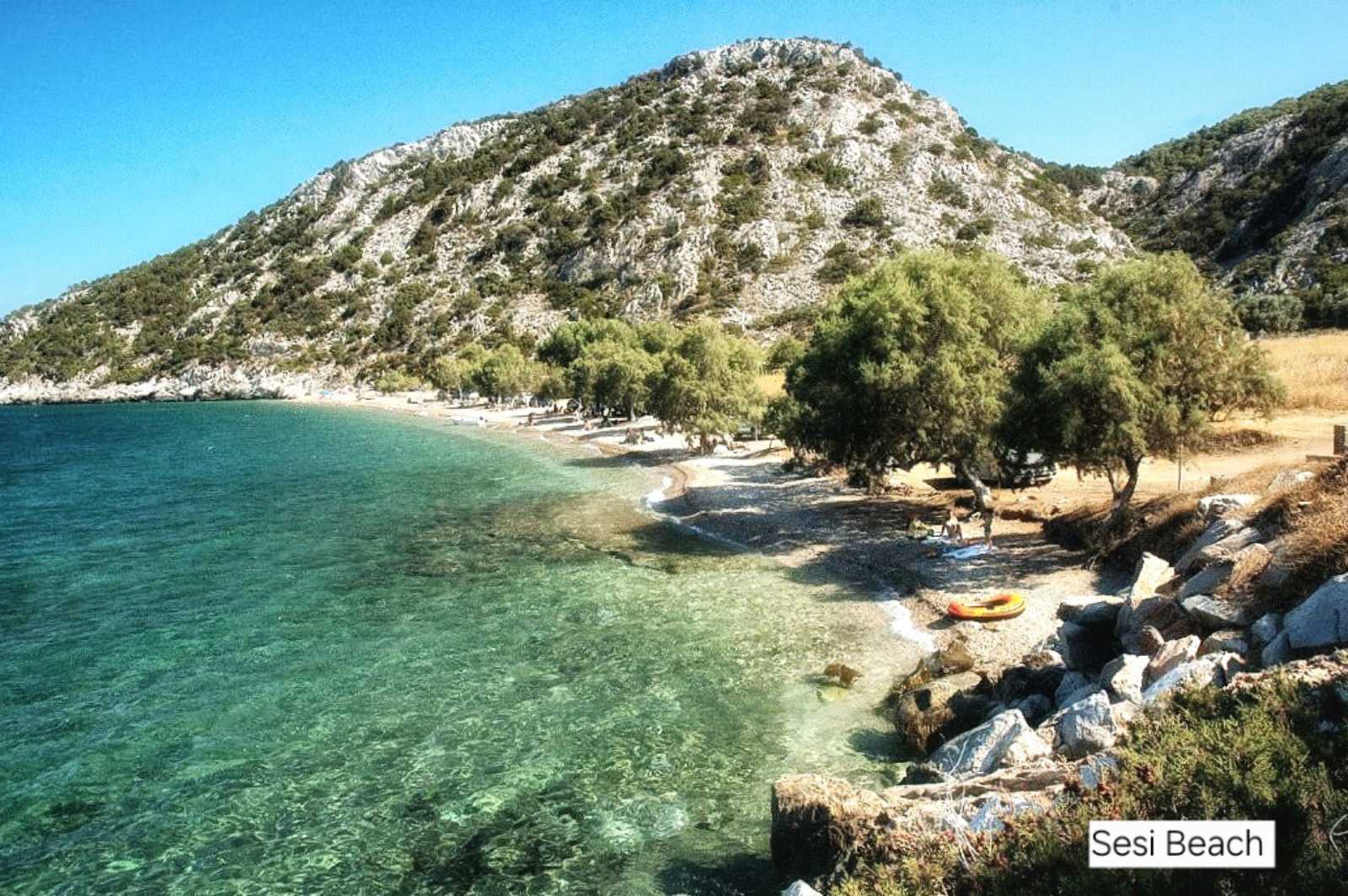 The small Sesi beach. Crystal clear waters, easy and ample parking space, umbrellas and tamarisk trees for shade, sandy bottom, good infrastructure for coffee and food, quiet and ideal atmosphere.