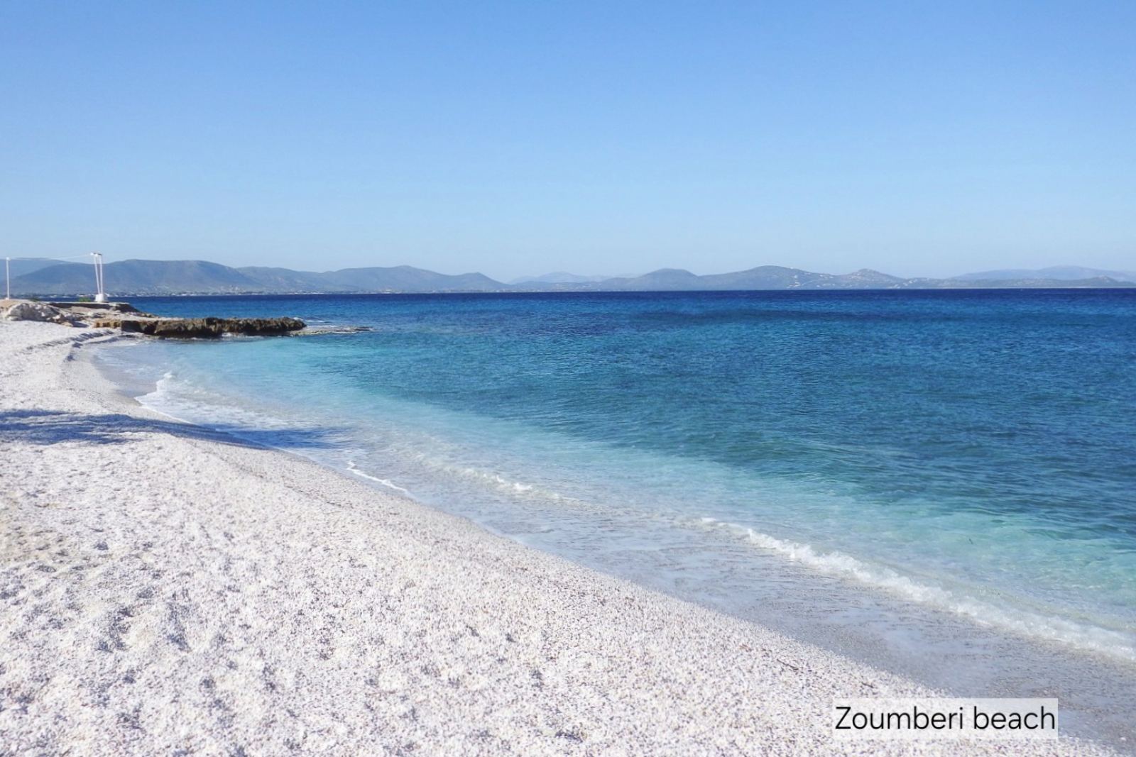 In Zoumperi, the beach with its small white pebbles makes the blue deafening. An excellent choice for everyone, even the most difficult.